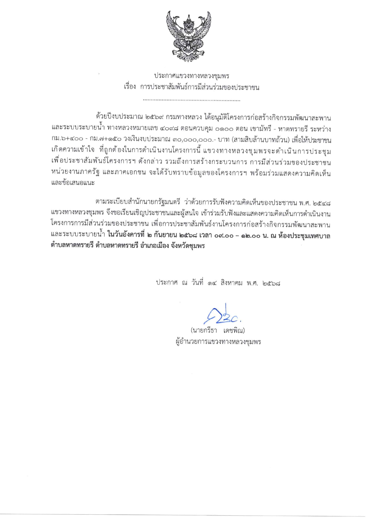ขอเชิญประชาชนสองข้างทาง และผู้สนใจเข้าร่วม โครงการการมีส่วนร่วมของประชาชน กิจกรรมก่อสร้าง เพิ่มประสิทธิภาพทางหลวง งานก่อสร้างเพิ่มประสิทธิภาพทางหลวง