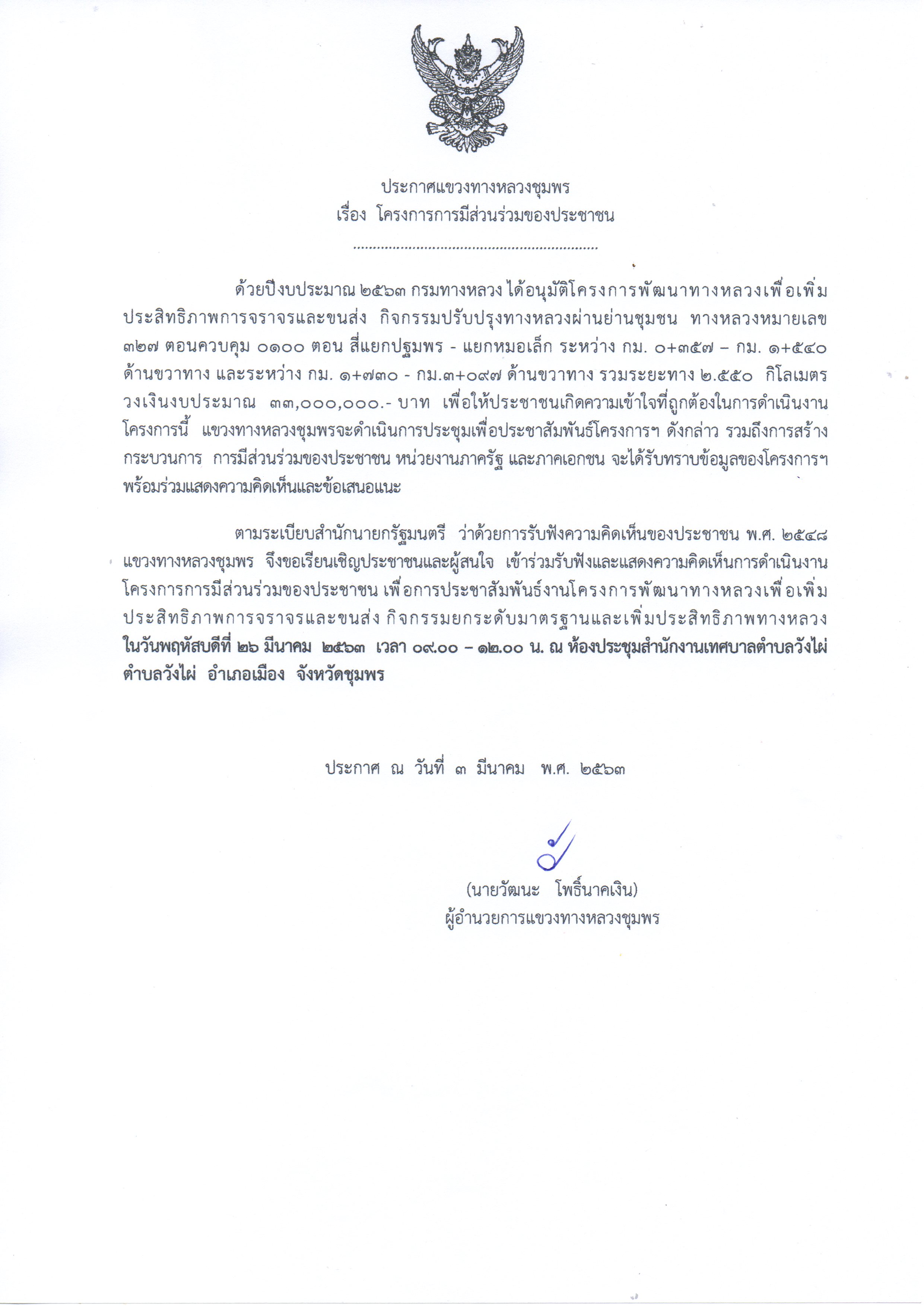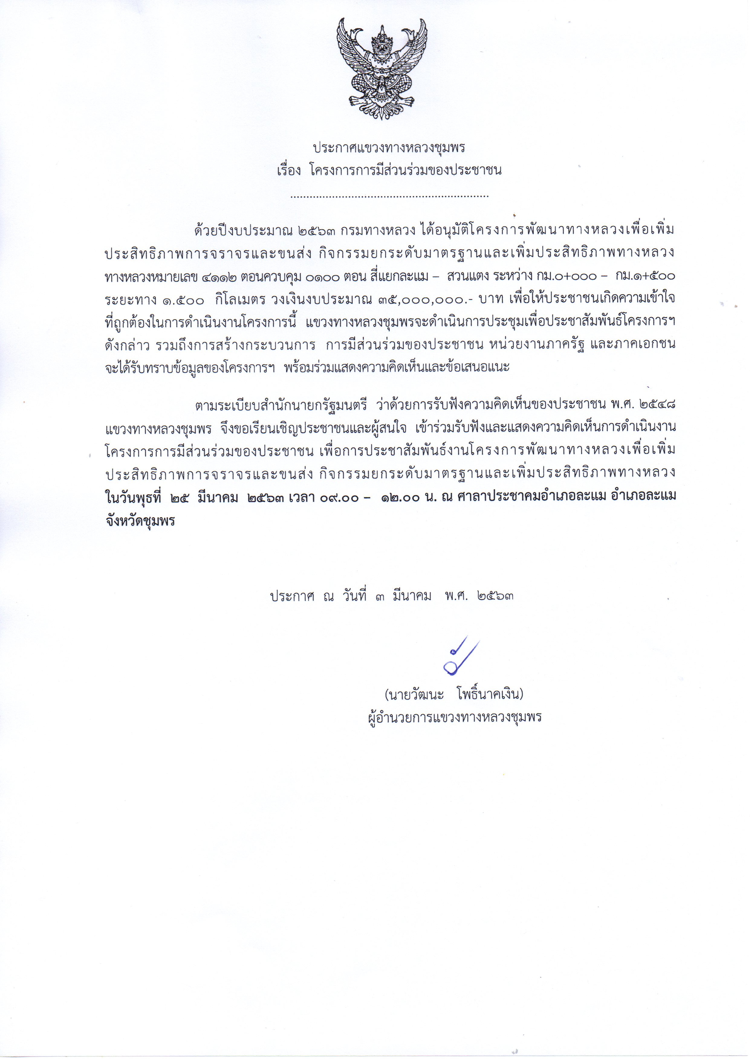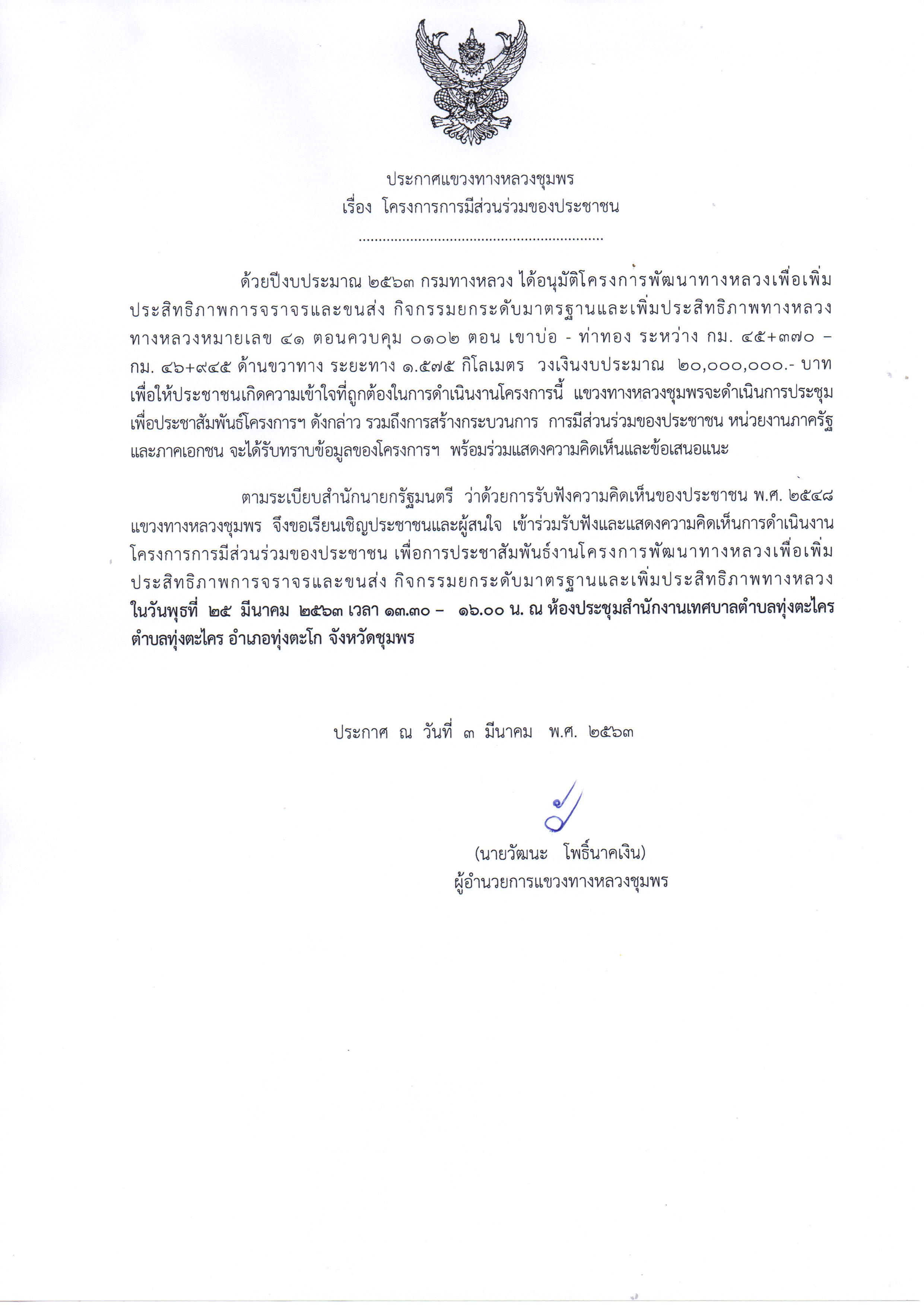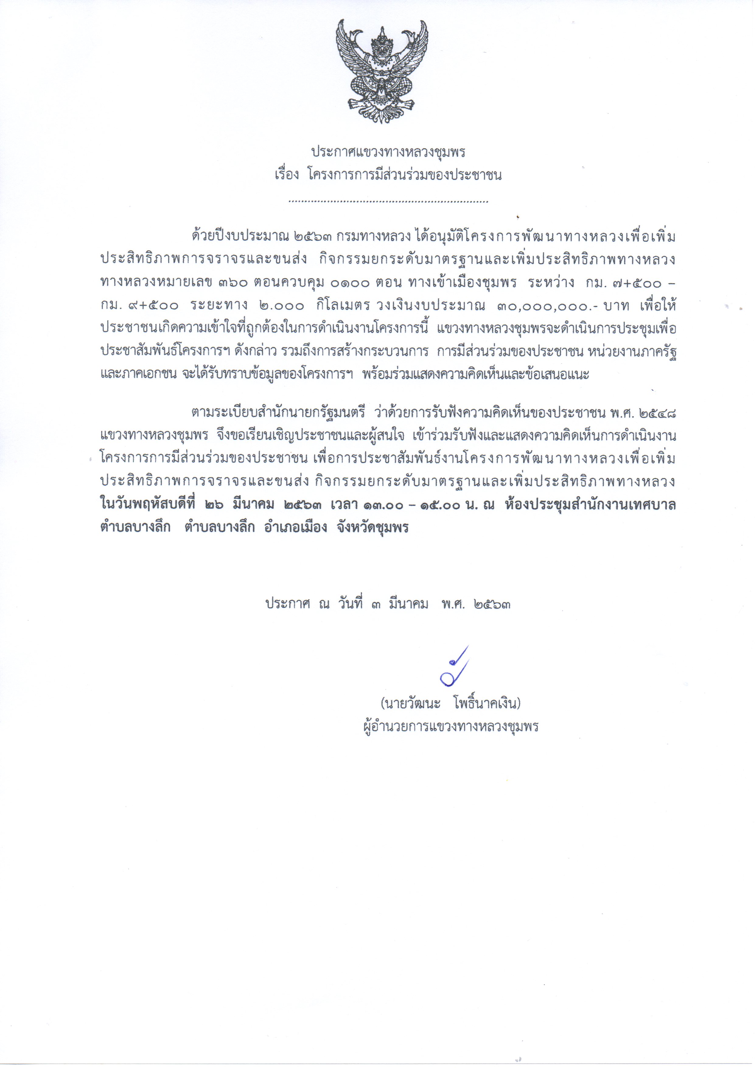 ขอเชิญผู้สนใจเช้าร่วมประชุมการประชาสัมพันธ์ "โครงการพัฒนาทางหลวง เพื่อเพิ่มประสิทธิภาพการจราจรและขนส่ง"