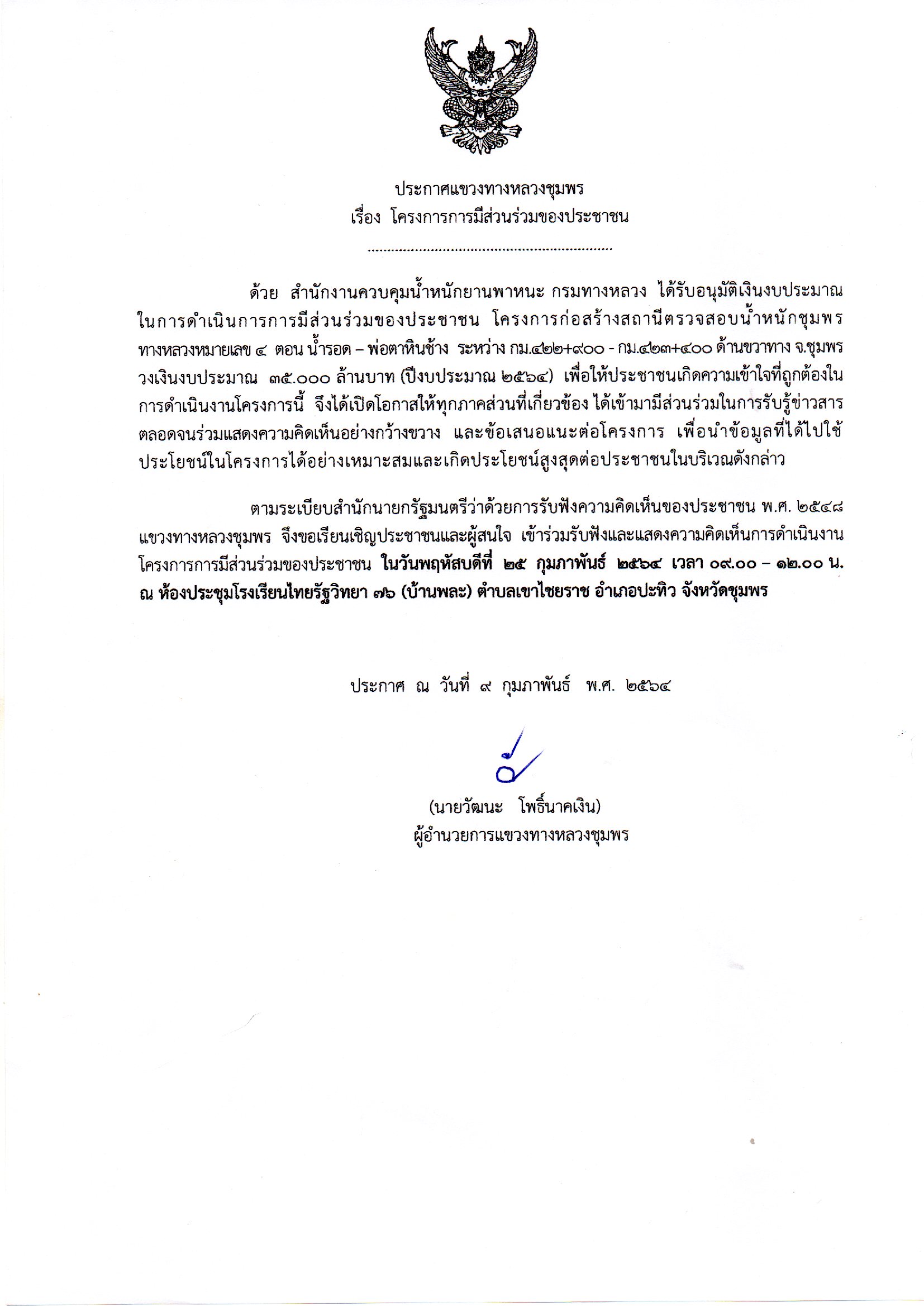 ขอเชิญประชาชนสองข้างทางและประชาชนผู้สนใจเข้าร่วมประชุมเพื่อรับฟังการประชาสัมพันธ์โครงการ ในการดำเนินการการมีส่วนร่วมของประชาชน