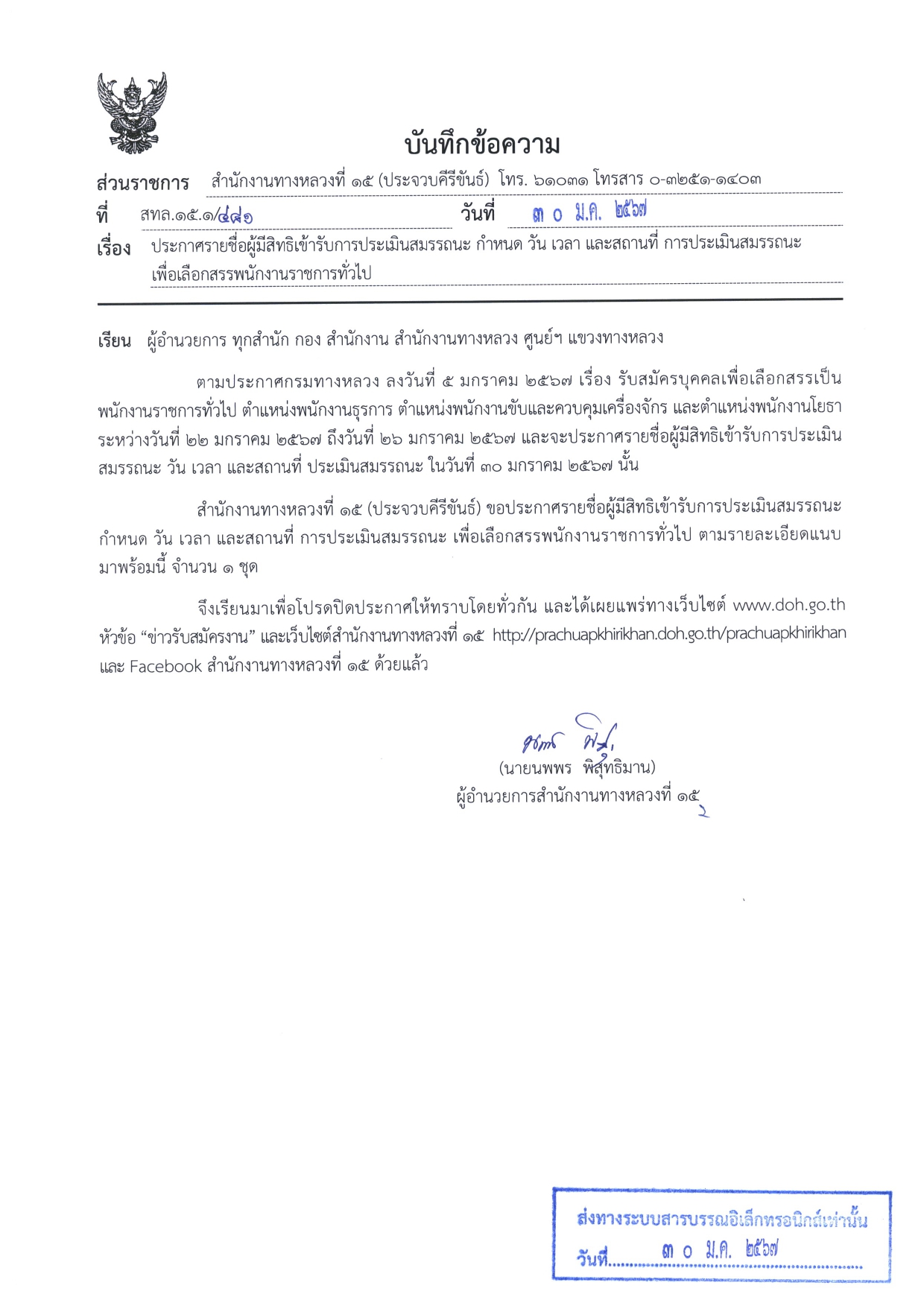 สำนักงานทางหลวงที่ ๑๕ (ประจวบคีรีขันธ์) ขอประกาศรายชื่อผู้มีสิทธิ์เข้ารับการประเมินสมรรถนะ กำหนด วัน เวลา และสถานที่ การประเมินสมรรถนะ เพื่อเลือกสรรพนักงานราชการทั่วไป ตำแหน่งพนักงานธุรการ ตำแหน่งพนักงานขับและควบคุมเครื่องจักร และตำแหน่งพนักงานโยธา