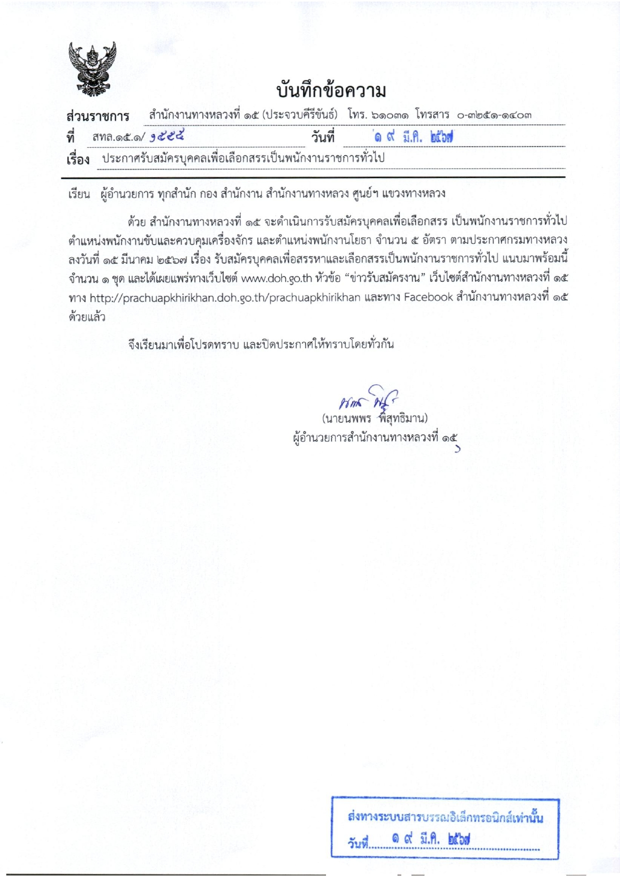 ***ผู้ประสงค์จะสมัคร ขอและยื่นใบสมัครด้วยตนเองได้ที่งานสารบรรณ สำนักงานทางหลวงที่ 15 กรมทางหลวง อ.หัวหิน จ.ประจวบคีรีขันธ์ ตั้งแต่วันที่ 28 มีนาคม 2567 ถึงวันที่ 3 เมษายน 2567 ในวันและเวลาราชการ