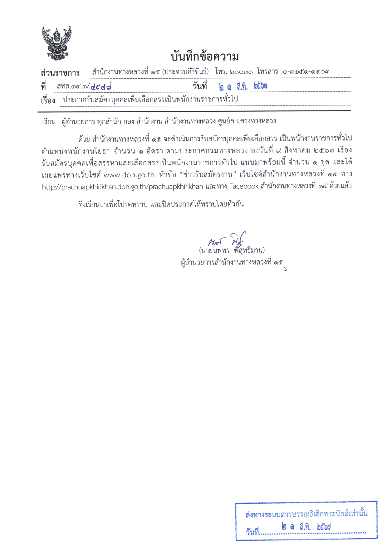 ***ผู้ประสงค์จะสมัคร ขอและยื่นใบสมัครด้วยตนเองได้ที่งานสารบรรณ สำนักงานทางหลวงที่ 15 กรมทางหลวง อ.หัวหิน จ.ประจวบคีรีขันธ์ ตั้งแต่วันที่ 28 สิงหาคม 2567 ถึงวันที่ 3 กันยายน 2567 ในวันและเวลาราชการ