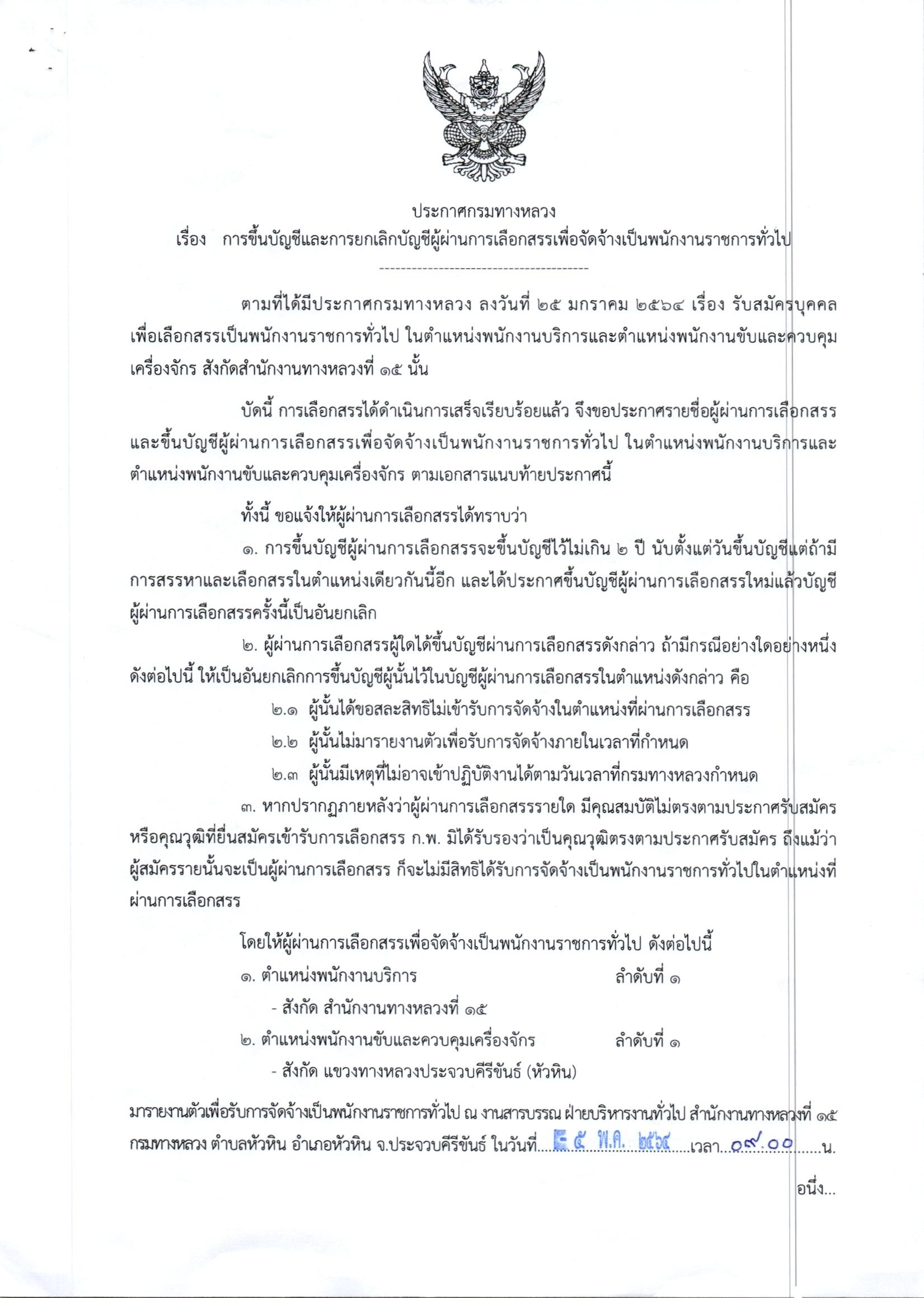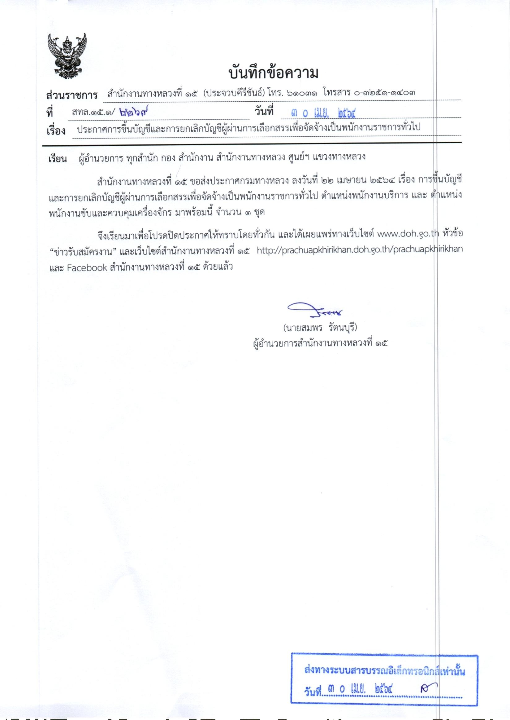 1. ตำแหน่งพนักงานบริการ จำนวน 1 อัตรา สังกัดสำนักงานทางหลวงที่ 15 (ประจวบคีรีขันธ์)