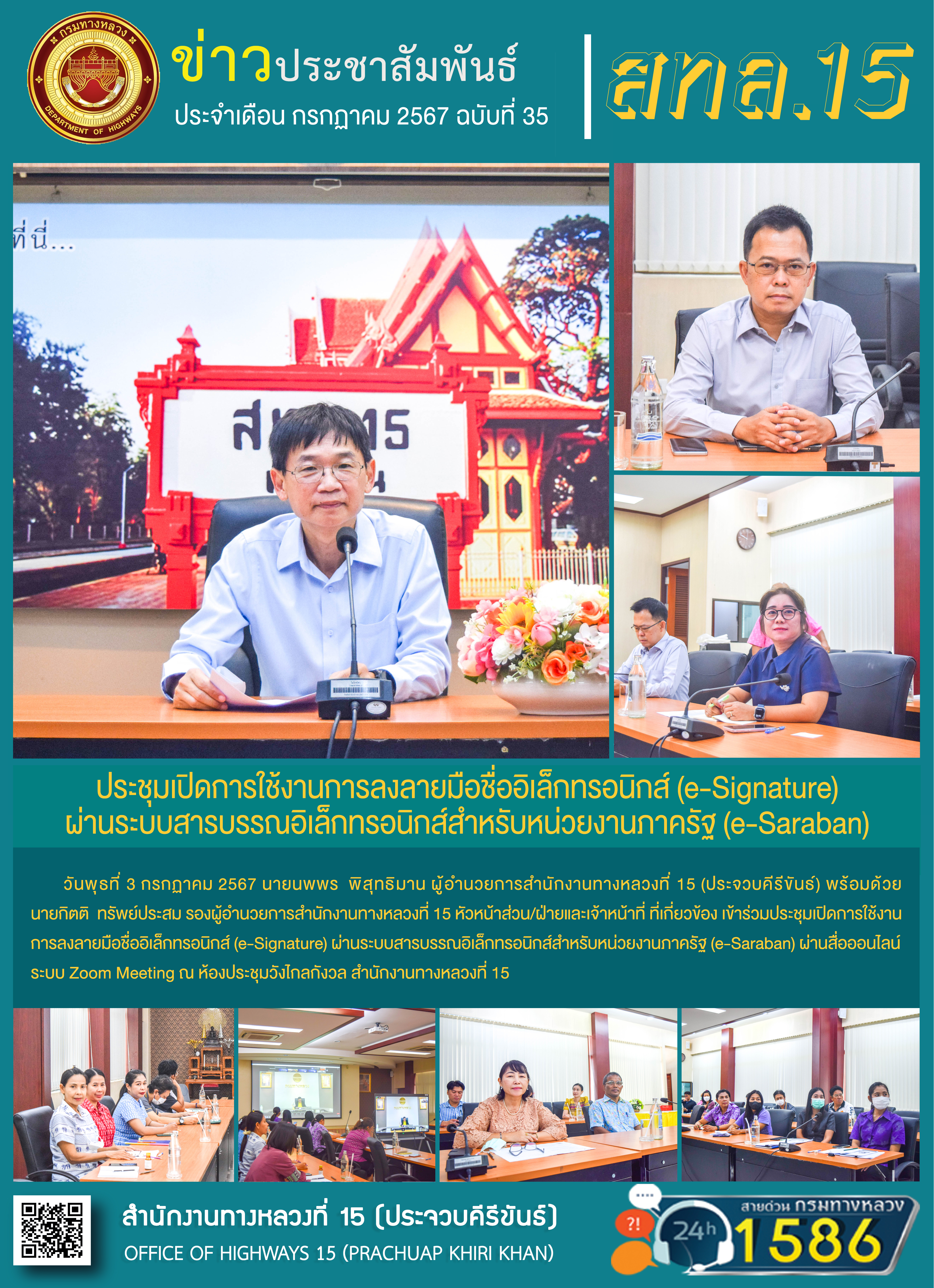 วันที่ 3 กรกฎาคม 2567 นายนพพร พิสุทธิมาน ผู้อำนวยการสำนักงานทางหลวงที่ 15 (ประจวบคีรีขันธ์) พร้อมด้วยนายกิตติ ทรัพย์ประสม รองผู้อำนวยการสำนักงานทางหลวงที่ 15 หัวหน้าส่วน/ฝ่ายและเจ้าหน้าที่ที่เกี่ยวข้อง เข้าร่วมประชุมเปิดการใช้งานการลงลายมือชื่ออิเล็กทรอนิกส์ (e-Signature) ผ่านระบบ