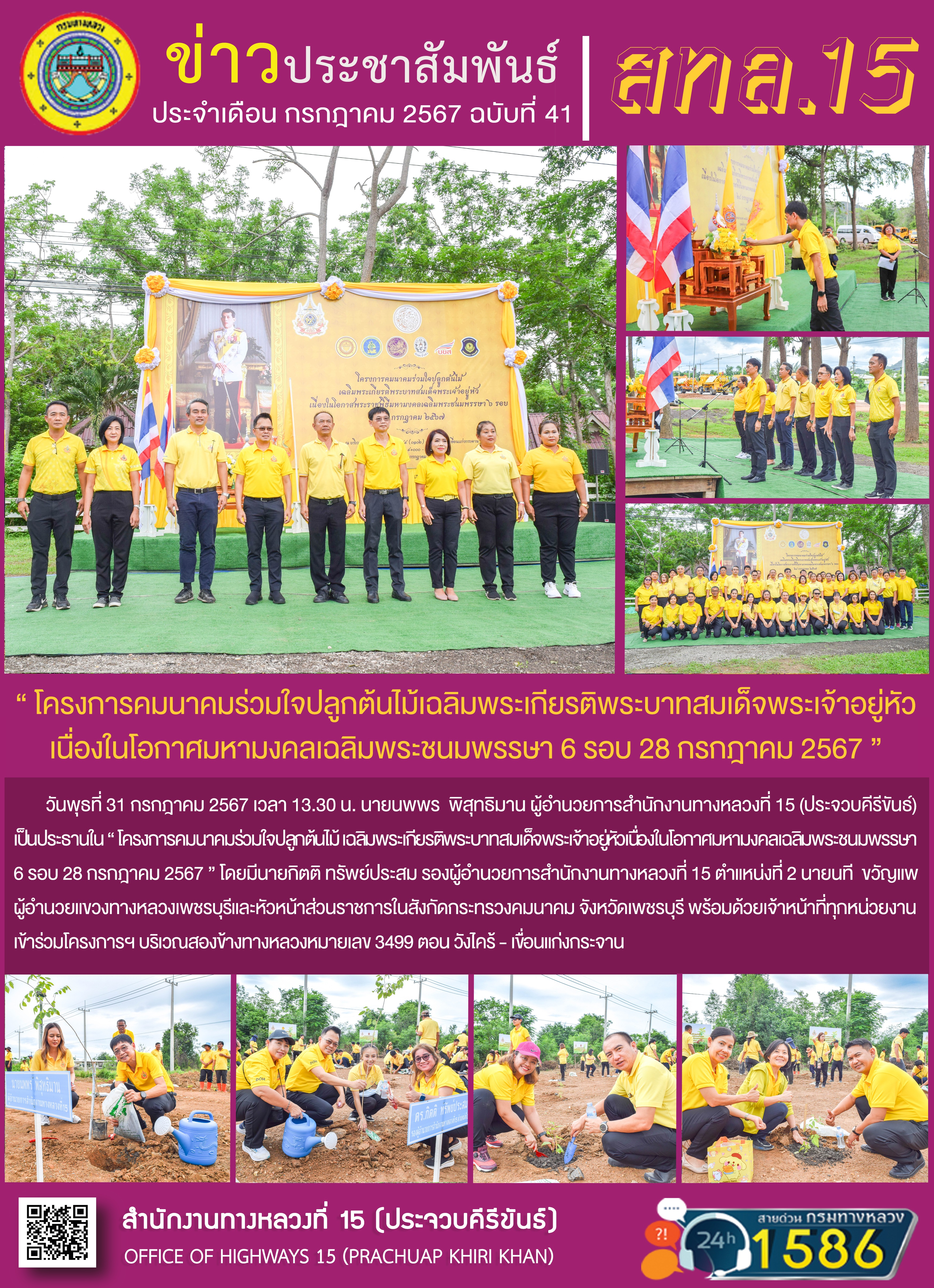 วันที่ 31 กรกฎาคม 2567 เวลา 13.30 น. นายนพพร พิสุทธิมาน ผู้อำนวยการสำนักงานทางหลวงที่ 15 เป็นประธานใน “โครงการคมนาคมร่วมใจปลูกต้นไม้ เฉลิมพระเกียรติพระบาทสมเด็จพระเจ้าอยู่หัวเนื่องในโอกาสพระราชพิธีมหามงคลเฉลิมพระชนมพรรษา 6 รอบ 28 กรกฎาคม 2567” โดยมีนายกิตติ ทรัพย์ประสม รองผู้อำนวยการสำนักงานทางหลวงที่ 15 ตำแหน่งที่ 2 นายนที ขวัญแพ ผู้อำนวยการแขวงทางหลวงเพชรบุรีและหัวส่วนราชการในสังกัดกระทรวงคมนาคม จังหวัดเพชรบุรี พร้อมด้วยเจ้าหน้าที่ทุกหน่วยงาน เข้าร่วมโครงการฯ บริเวณสองข้างทางหลวงหมายเลข 3499 ตอน วังไคร้ - เขื่อนแก่งกระจาน