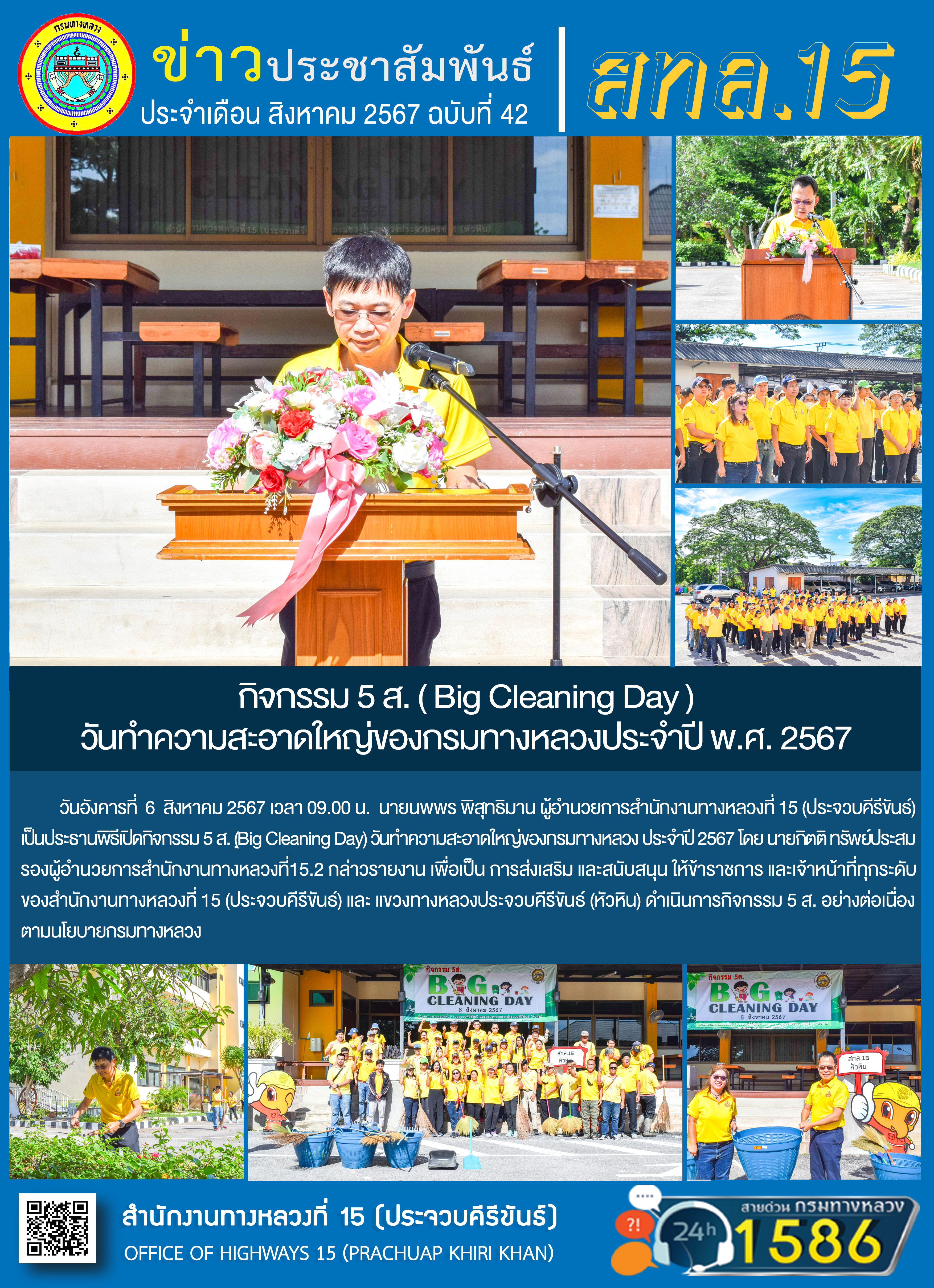 วันอังคารที่ 6 สิงหาคม 2567 เวลา 09.00 น. นายนพพร พิสุทธิมาน ผู้อำนวยการสำนักงานทางหลวงที่15 (ประจวบคีรีขันธ์) เป็นประธานพิธีเปิดกิจกรรม 5 ส. (Big Cleaning Day) วันทำความสะอาดใหญ่ของกรมทางหลวง ประจำปี 2567 โดย นายกิตติ ทรัพย์ประสม รองผู้อำนวยการสำนักงานทางหลวงที่15.2 กล่าวรายงาน เพื่อเป็น การส่งเสริม และสนับสนุน ให้ข้าราชการ และเจ้าหน้าที่ทุกระดับของสำนักงานทางหลวงที่ 15 (ประจวบคีรีขันธ์) และ แขวงทางหลวงประจวบคีรีขันธ์ (หัวหิน) ดำเนินการกิจกรรม 5 ส. อย่างต่อเนื่อง ตามนโยบายกรมทางหลวง