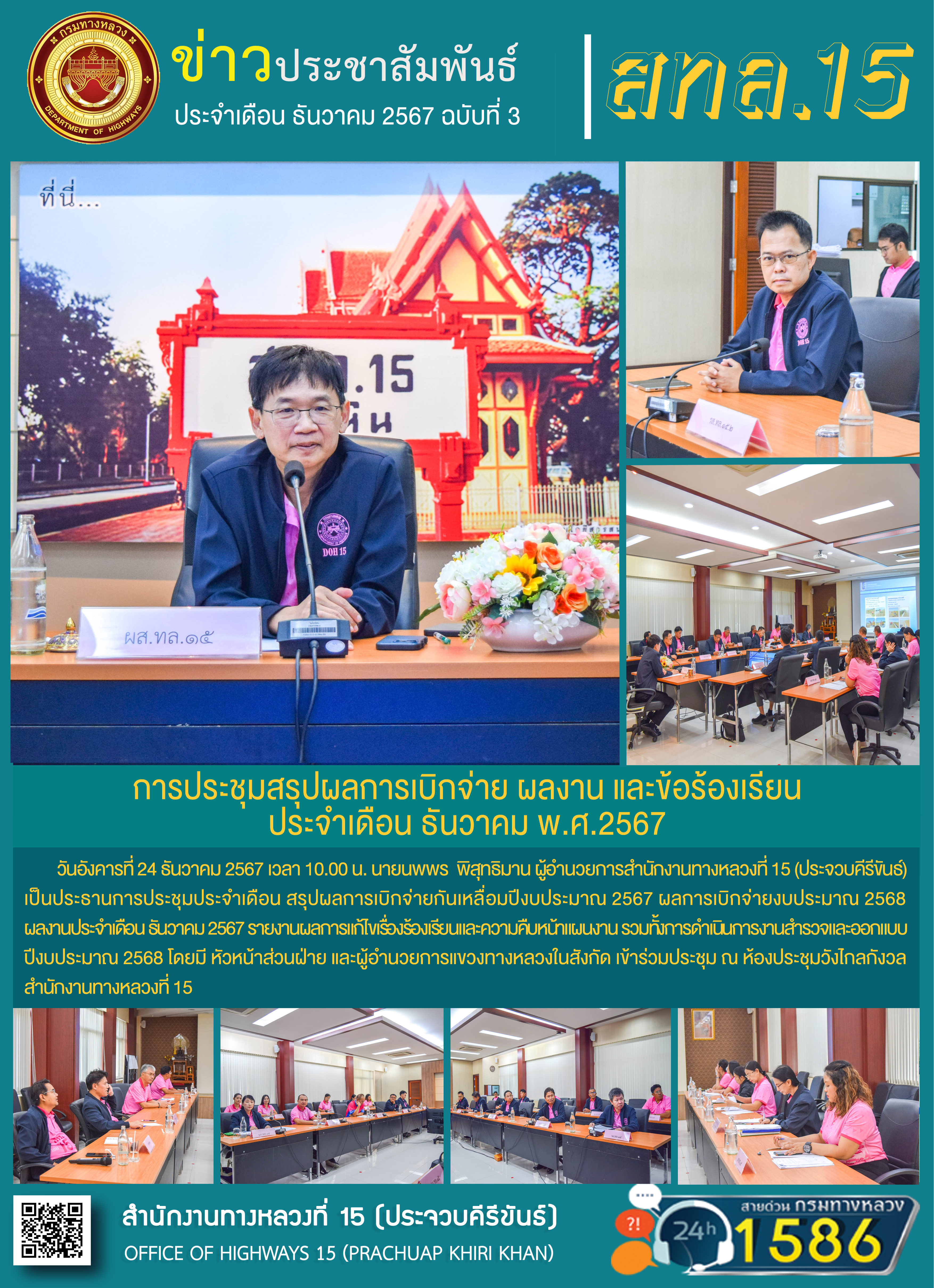 วันอังคารที่ 24 ธันวาคม 2567 เวลา 10.00 น. นายนพพร พิสุทธิมาน ผู้อำนวยการสำนักงานทางหลวงที่ 15 (ประจวบคีรีขันธ์)