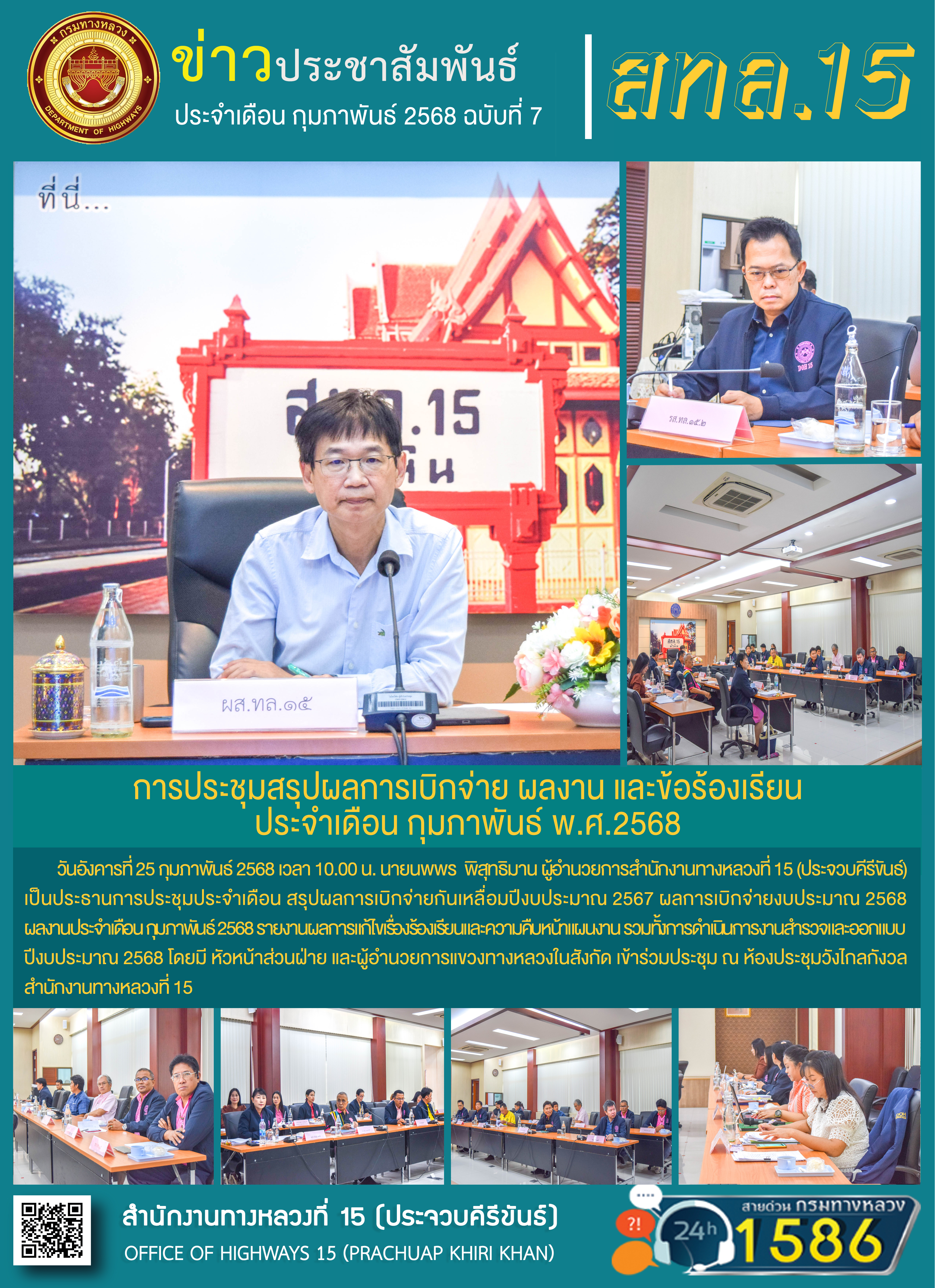 วันอังคารที่ 25 กุมภาพันธ์ 2568 เวลา 10.00 น. นายนพพร พิสุทธิมาน ผู้อำนวยการสำนักงานทางหลวงที่ 15 (ประจวบคีรีขันธ์) เป็นประธานการประชุมประจำเดือน สรุปผลการเบิกจ่ายกันเหลื่อมปีงบประมาณ 2567 ผลการเบิกจ่ายงบประมาณ 2568 ผลงานประจำเดือน กุมภาพันธ์ 2568 รายงานผลการแก้ไขเรื่องร้องเรียนและความคืบหน้าแผนงาน รวมทั้งการดำเนินการงานสำรวจและออกแบบ ปีงบประมาณ 2568 โดยมี หัวหน้าส่วนฝ่าย และผู้อำนวยการแขวงทางหลวงในสังกัด เข้าร่วมประชุม ณ ห้องประชุมวังไกลกังวล