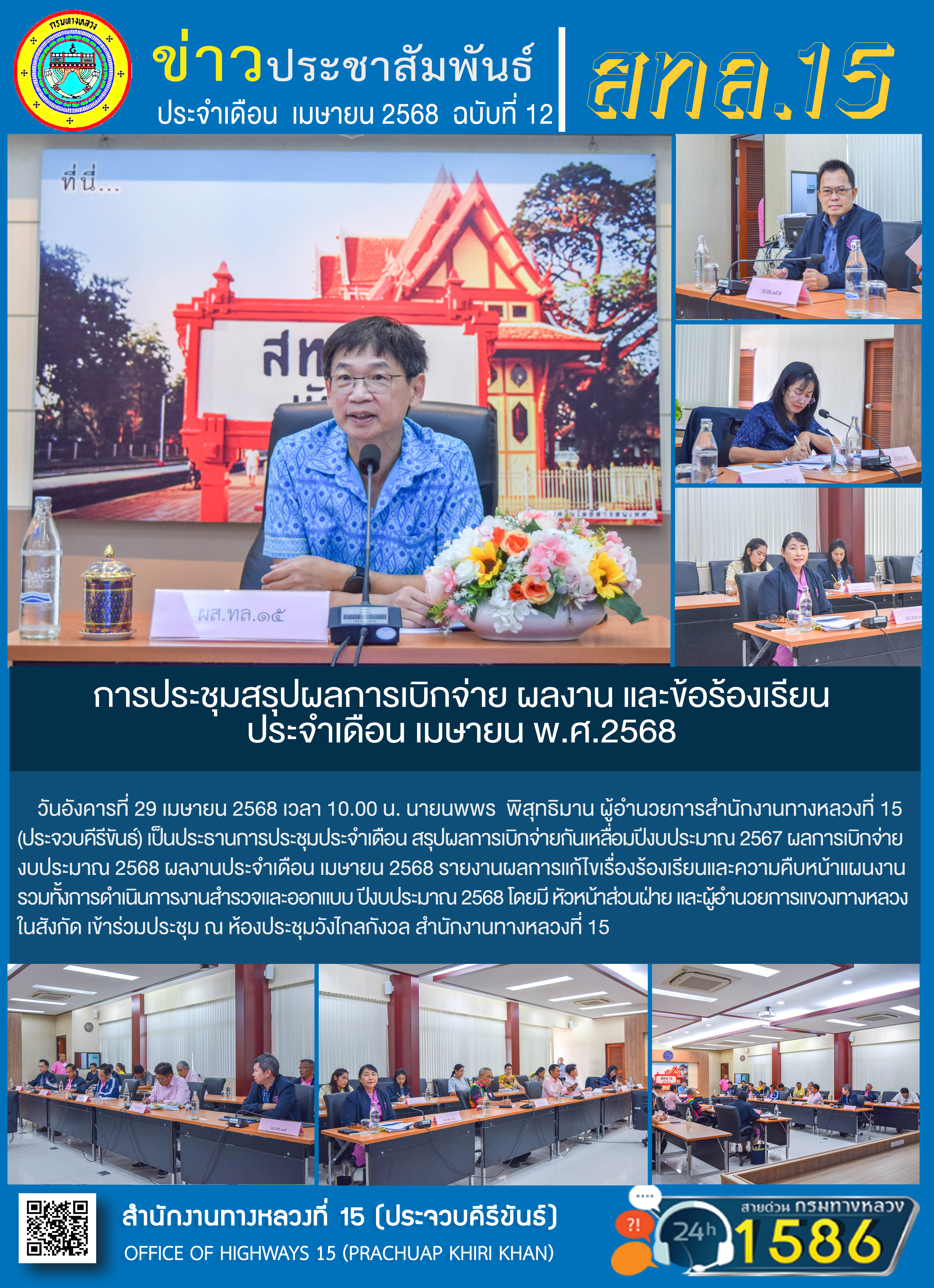 วันอังคารที่ 29 เมษายน 2568 เวลา 10.00 น. นายนพพร พิสุทธิมาน ผู้อำนวยการสำนักงานทางหลวงที่ 15 (ประจวบคีรีขันธ์) เป็นประธานการประชุมประจำเดือน สรุปผลการเบิกจ่ายกันเหลื่อมปีงบประมาณ 2567 ผลการเบิกจ่ายงบประมาณ 2568 ผลงานประจำเดือน เมษายน 2568 รายงานผลการแก้ไขเรื่องร้องเรียนและความคืบหน้าแผนงาน รวมทั้งการดำเนินการงานสำรวจและออกแบบ ปีงบประมาณ 2568 โดยมี หัวหน้าส่วนฝ่าย และผู้อำนวยการแขวงทางหลวงในสังกัด เข้าร่วมประชุม ณ ห้องประชุมวังไกลกังวล สำนักงานทางหลวงที่ 15