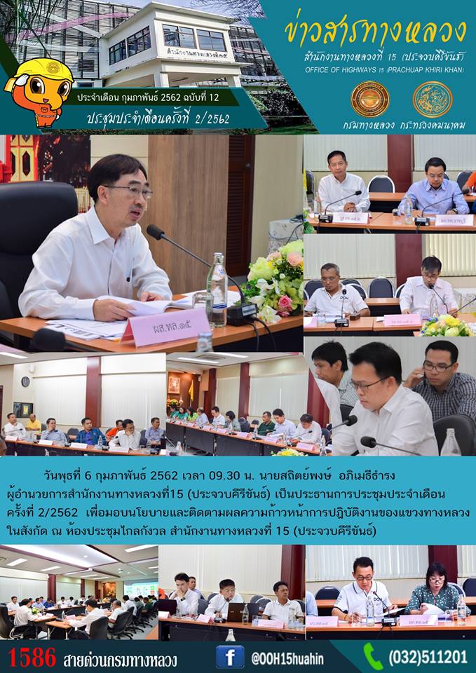 วันพุธที่ 6 กุมภาพันธ์ 2562 เวลา 09.30 น. นายสถิตย์พงษ์ อภิเมธีธำรง ผู้อำนวยการสำนักงานทางหลวงที่15 (ประจวบคีรีขันธ์) เป็นประธานการประชุมประจำเดือน ครั้งที่ 2/2562 เพื่อมอบนโยบายและติดตามผลความก้าวหน้าการปฎิบัติงานของแขวงทางหลวงในสังกัด ณ ห้องประชุมไกลกังวล สำนักงานทางหลวงที่ 15 (ประจวบคีรีขันธ์)