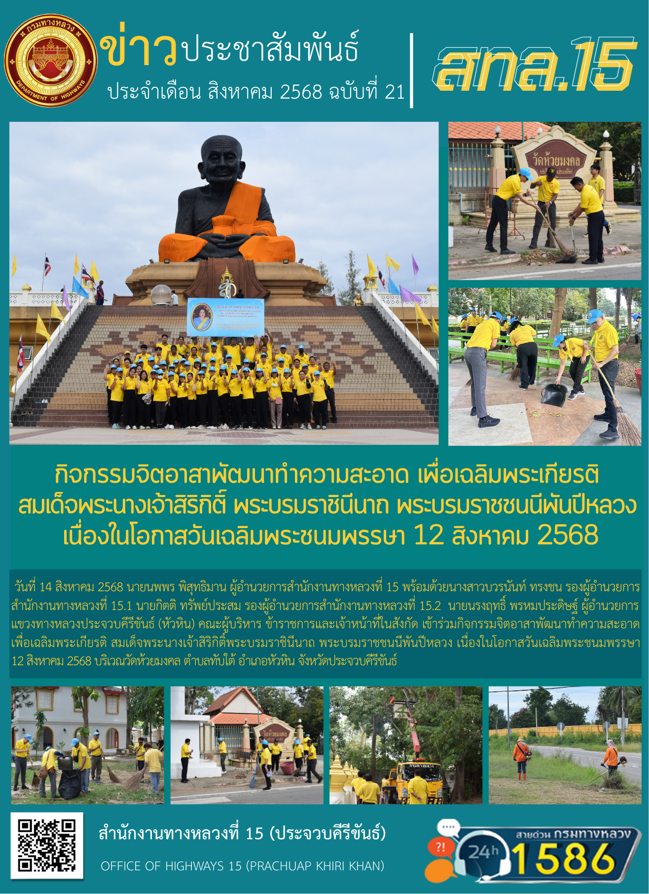วันที่ 14 สิงหาคม 2568 นายนพพร พิสุทธิมาน ผู้อำนวยการสำนักงานทางหลวงที่ 15 พร้อมด้วยนางสาวบวรนันท์ ทรงชน รองผู้อำนวยการสำนักงานทางหลวงที่ 15.1 นายกิตติ ทรัพย์ประสม รองผู้อำนวยการสำนักงานทางหลวงที่ 15.2 นายนรงฤทธิ์ พรหมประดิษฐ์ ผู้อำนวยการแขวงทางหลวงประจวบคีรีขันธ์ (หัวหิน) คณะผู้บริหาร ข้าราชการและเจ้าหน้าที่ในสังกัด เข้าร่วมกิจกรรมจิตอาสาพัฒนาทำความสะอาด เพื่อเฉลิมพระเกียรติ สมเด็จพระนางเจ้าสิริกิติ์พระบรมราชินีนาถ พระบรมราชชนนีพันปีหลวง เนื่องในโอกาสวันเฉลิมพระชนมพรรษา 12 สิงหาคม 2568บริเวณวัดห้วยมงคล ตำบลทับใต้ อำเภอหัวหิน จังหวัดประจวบคีรีขันธ์