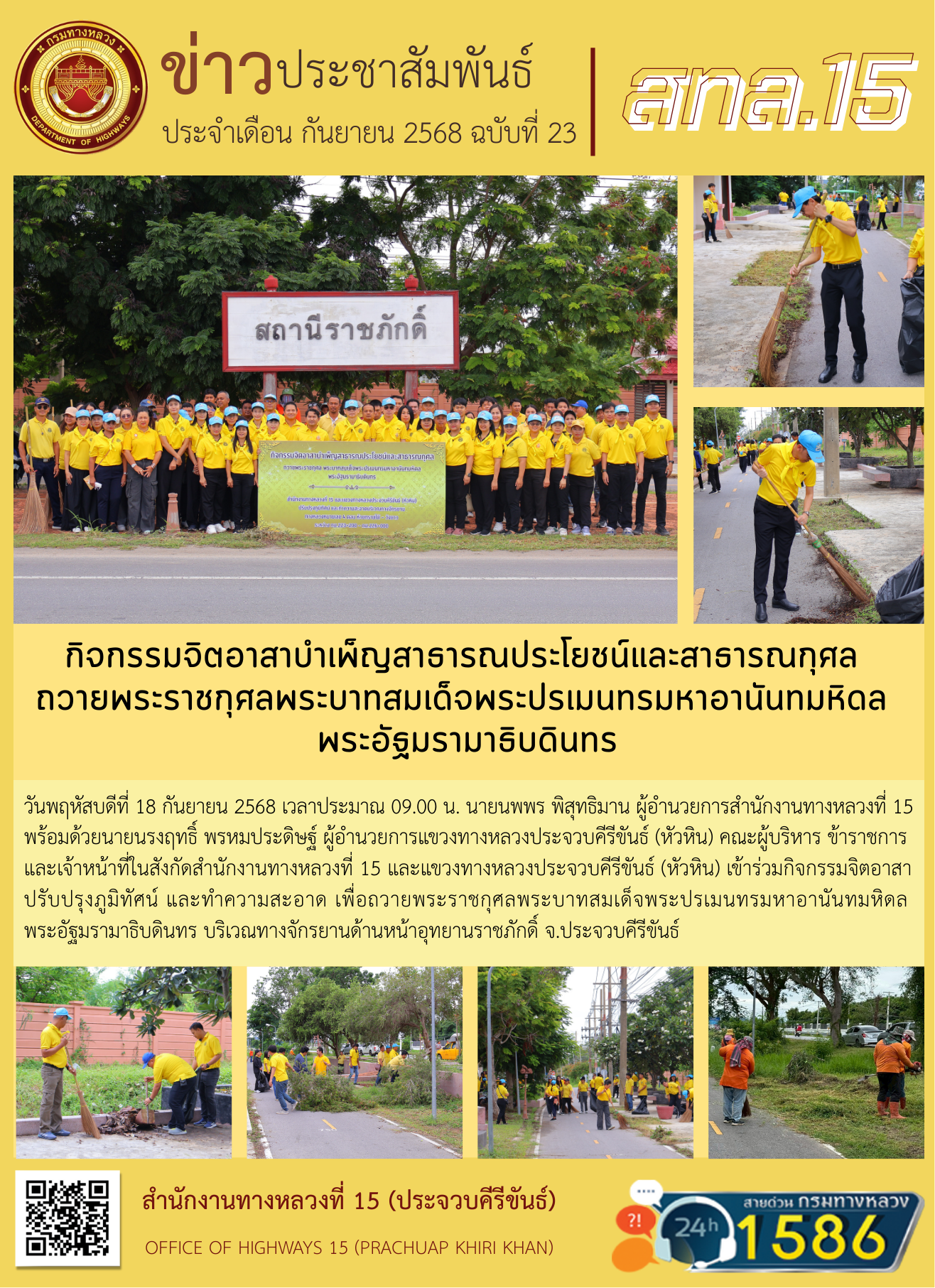 วันพฤหัสบดีที่ 18 กันยายน 2568 เวลาประมาณ 09.00 น. นายนพพร พิสุทธิมาน ผู้อำนวยการสำนักงานทางหลวงที่ 15 พร้อมด้วยนายนรงฤทธิ์ พรหมประดิษฐ์ ผู้อำนวยการแขวงทางหลวงประจวบคีรีขันธ์ (หัวหิน) คณะผู้บริหาร ข้าราชการ และเจ้าหน้าที่ในสังกัดสำนักงานทางหลวงที่ 15 และแขวงทางหลวงประจวบคีรีขันธ์ (หัวหิน) เข้าร่วมกิจกรรมจิตอาสาปรับปรุงภูมิทัศน์ และทำความสะอาด เพื่อถวายพระราชกุศลพระบาทสมเด็จพระปรเมนทรมหาอานันทมหิดล พระอัฐมรามาธิบดินทร บริเวณทางจักรยานด้านหน้าอุทยานราชภักดิ์ จ.ประจวบคีรีขันธ์