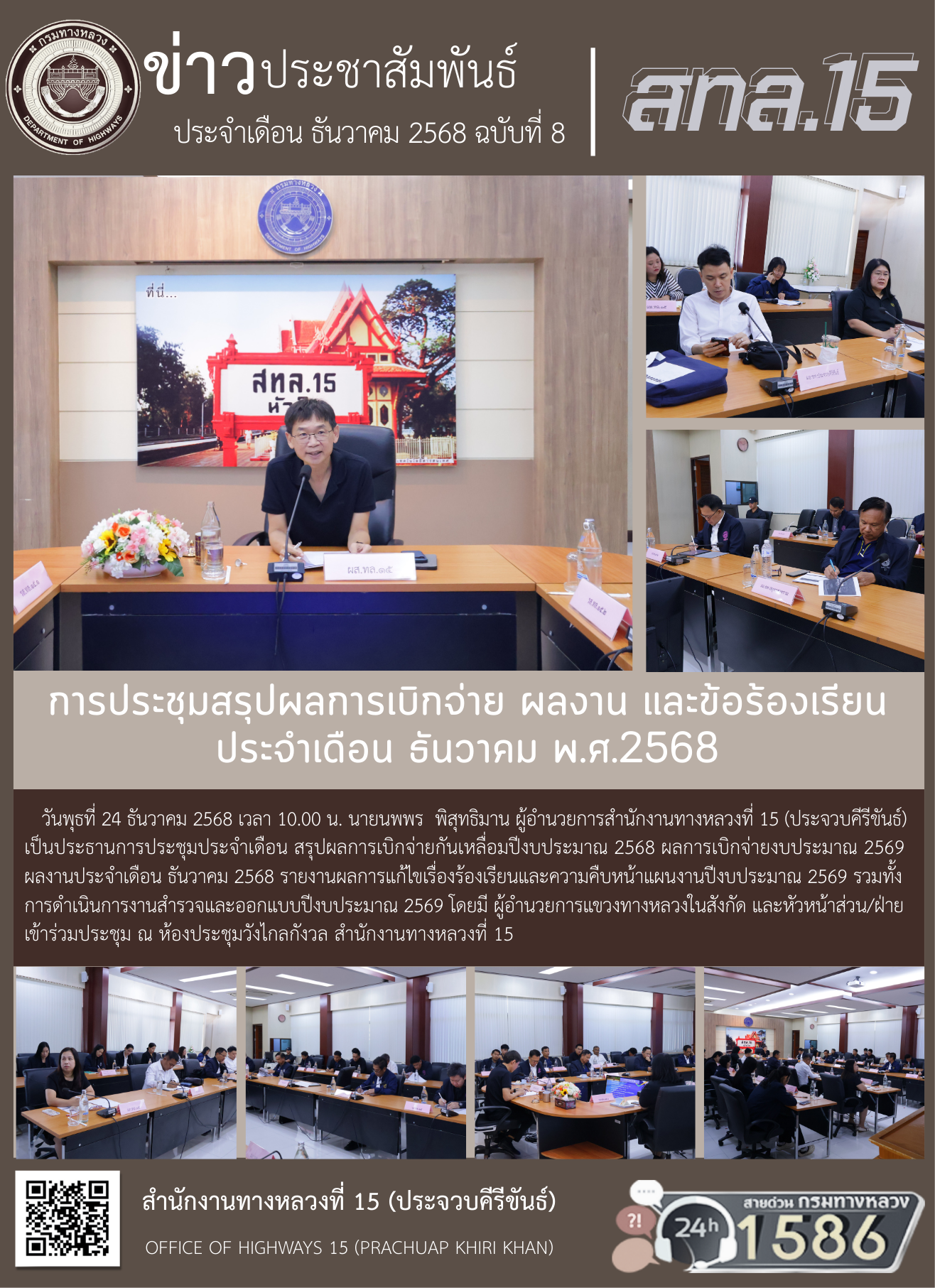 วันพุธที่ 24 ธันวาคม 2568 เวลา 10.00 น. นายนพพร พิสุทธิมาน ผู้อำนวยการสำนักงานทางหลวงที่ 15 (ประจวบคีรีขันธ์) เป็นประธานการประชุมประจำเดือน สรุปผลการเบิกจ่ายกันเหลื่อมปีงบประมาณ 2568 ผลการเบิกจ่ายงบประมาณ 2569 ผลงานประจำเดือน ธันวาคม 2568 รายงานผลการแก้ไขเรื่องร้องเรียนและความคืบหน้าแผนงานปีงบประมาณ 2569 รวมทั้งการดำเนินการงานสำรวจและออกแบบปีงบประมาณ 2569 โดยมี ผู้อำนวยการแขวงทางหลวงในสังกัด และหัวหน้าส่วน/ฝ่าย เข้าร่วมประชุม ณ ห้องประชุมวังไกลกังวล สำนักงานทางหลวงที่ 15