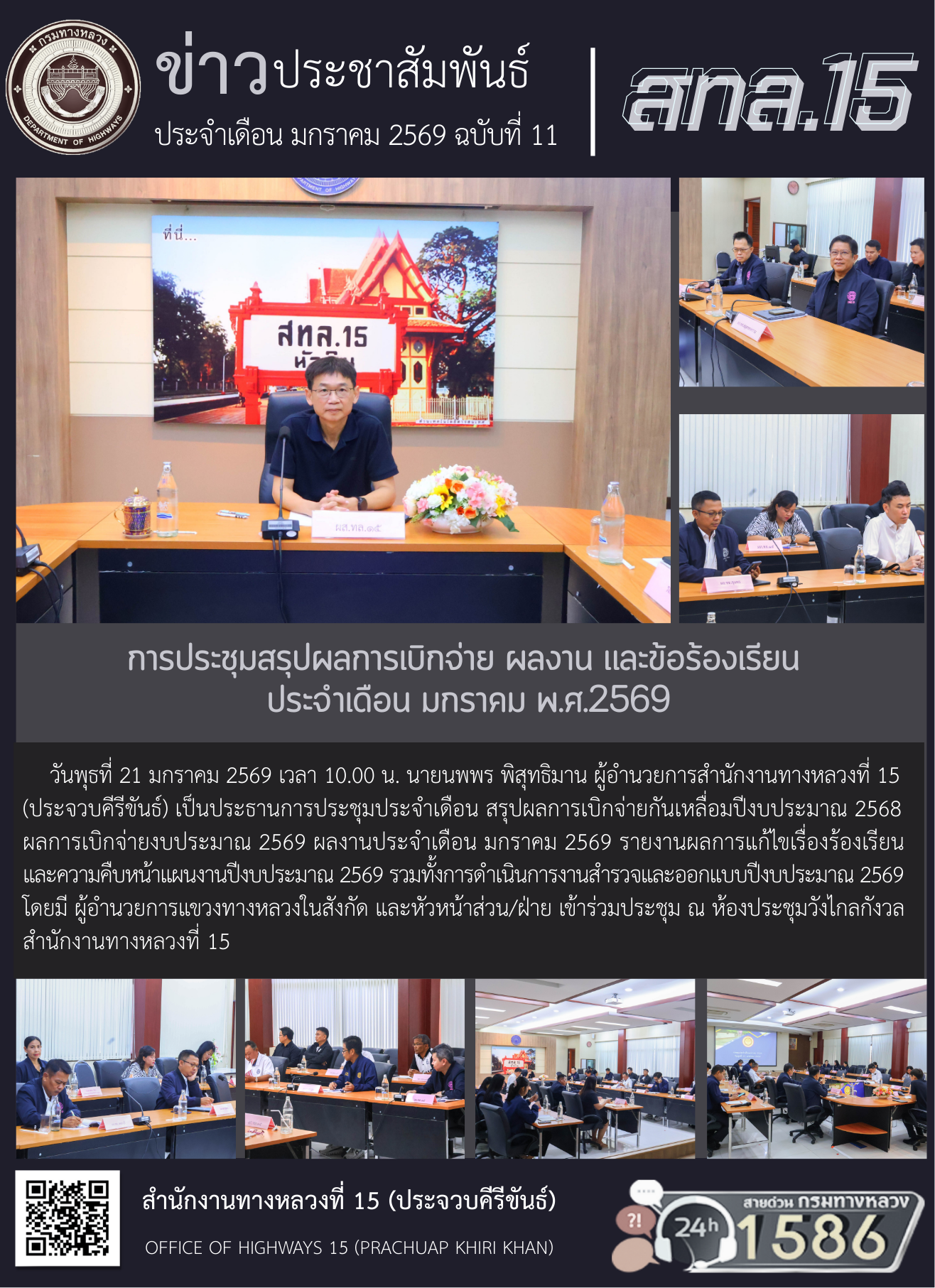 วันพุธที่ 21 มกราคม 2569 เวลา 10.00 น. นายนพพร พิสุทธิมาน ผู้อำนวยการสำนักงานทางหลวงที่ 15 (ประจวบคีรีขันธ์) เป็นประธานการประชุมประจำเดือน สรุปผลการเบิกจ่ายกันเหลื่อมปีงบประมาณ 2568 ผลการเบิกจ่ายงบประมาณ 2569 ผลงานประจำเดือน มกราคม 2569 รายงานผลการแก้ไขเรื่องร้องเรียน และความคืบหน้าแผนงานปีงบประมาณ 2569 รวมทั้งการดำเนินการงานสำรวจและออกแบบปีงบประมาณ 2569 โดยมี ผู้อำนวยการแขวงทางหลวงในสังกัด และหัวหน้าส่วน/ฝ่าย เข้าร่วมประชุม ณ ห้องประชุมวังไกลกังวล สำนักงานทางหลวงที่ 15