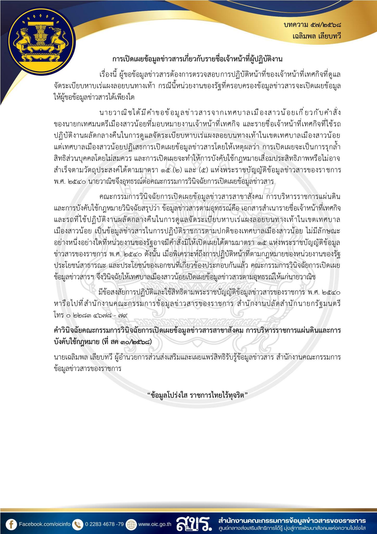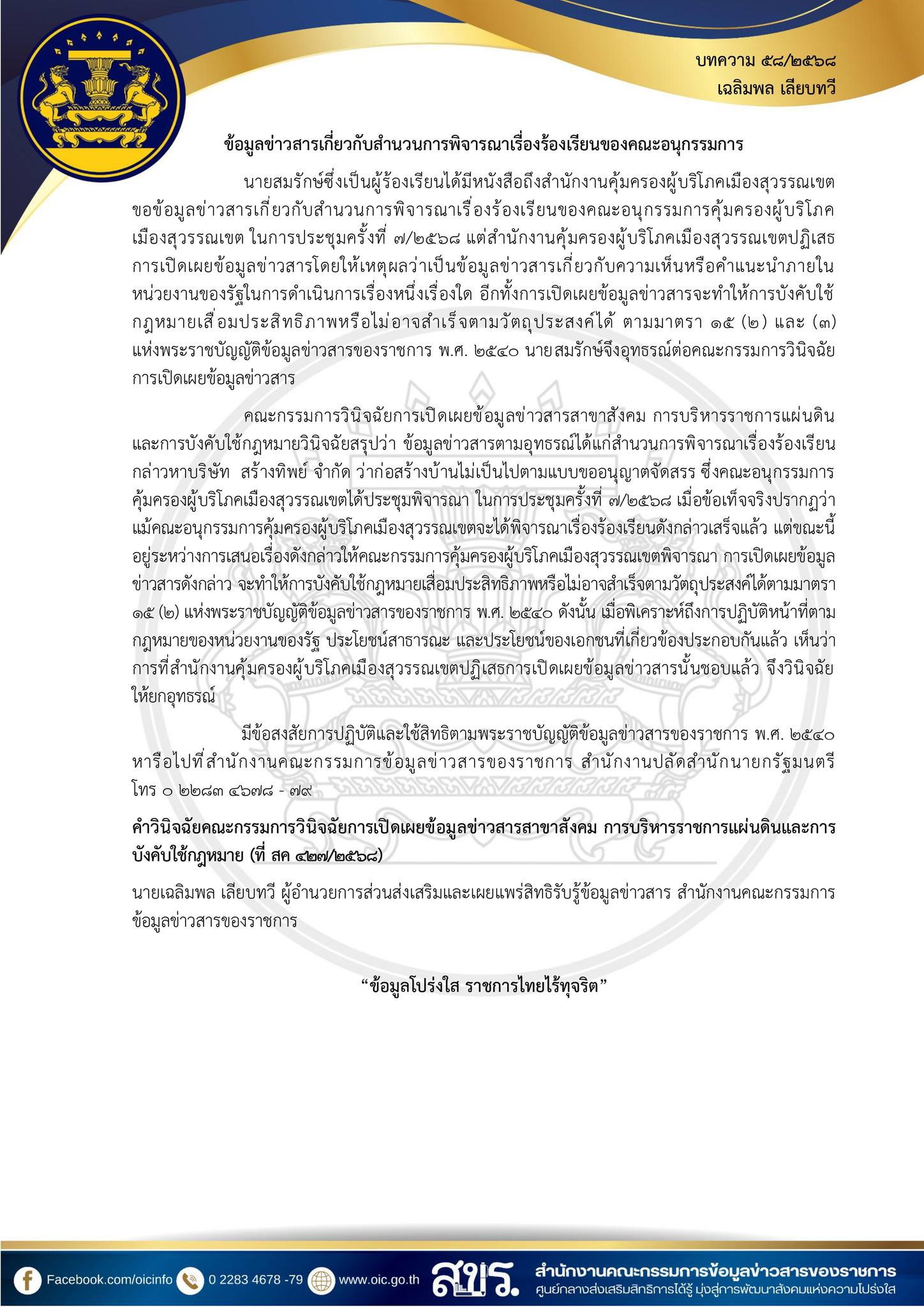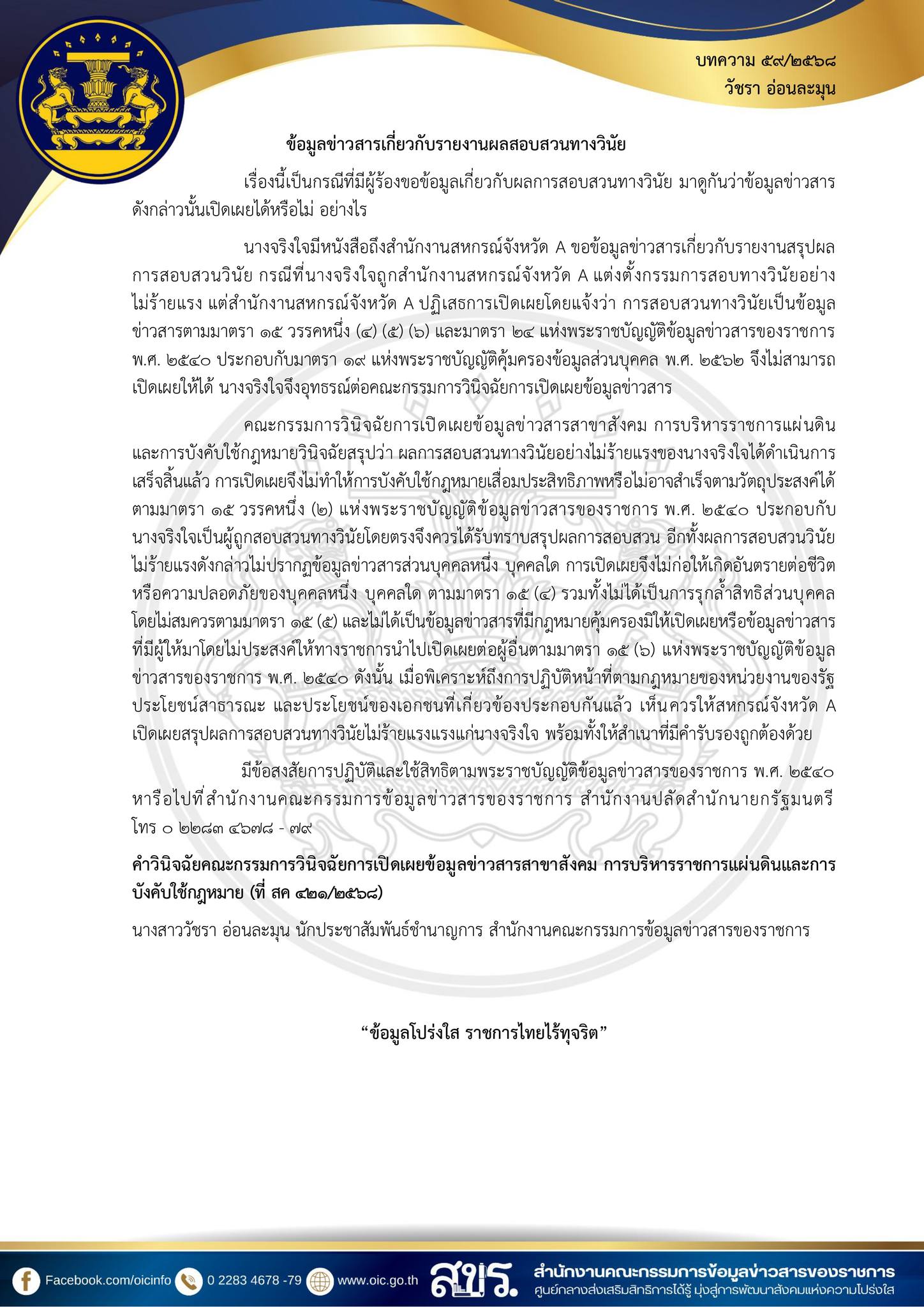 บคความคำวินิจฉัย ประจำเดือน ธันวาคม 2568 ของคณะกรรมการวิฉัยการเปิดเผยข้อมูลข่าวสาร เพื่อเผยแพร่ความรู้แก่ประชาชนและข้าราชการ ในการปฏิบัติตาม พระราชบัญญัติข้อมูลข่าวสารของราชการ พ.ศ. 2540