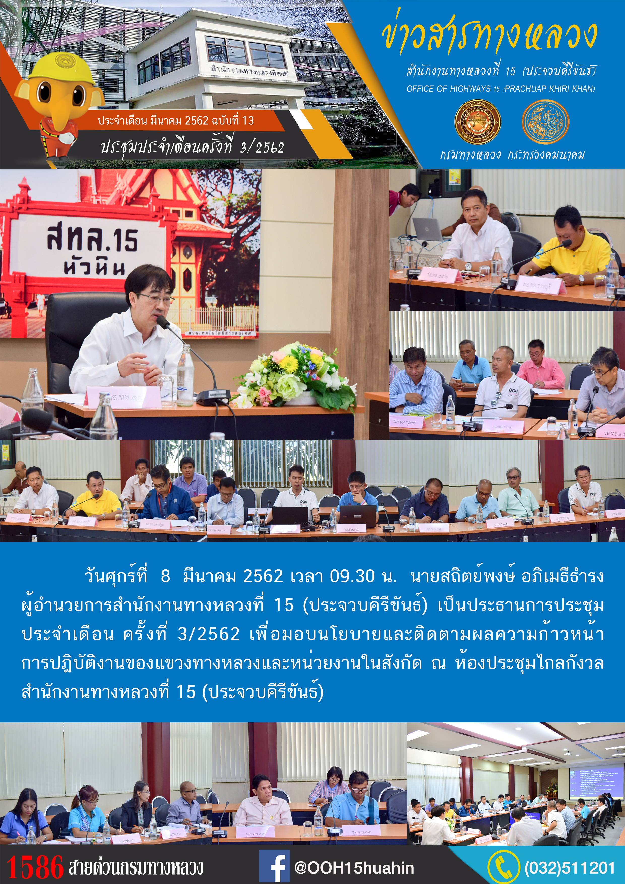 วันศุกร์ที่ 8 มีนาคม 2562 เวลา 09.30 น. นายสถิตย์พงษ์ อภิเมธีธำรง ผู้อำนวยการสำนักงานทางหลวงที่ 15 (ประจวบคีรีขันธ์) เป็นประธานการประชุม ประจำเดือน ครั้งที่ 3/2562 เพื่อมอบนโยบายและติดตามผลความก้าวหน้า การปฎิบัติงานของแขวงทางหลวงและหน่วยงานในสังกัด ณ ห้องประชุมไกลกังวล สำนักงานทางหลวงที่ 15 (ประจวบคีรีขันธ์)