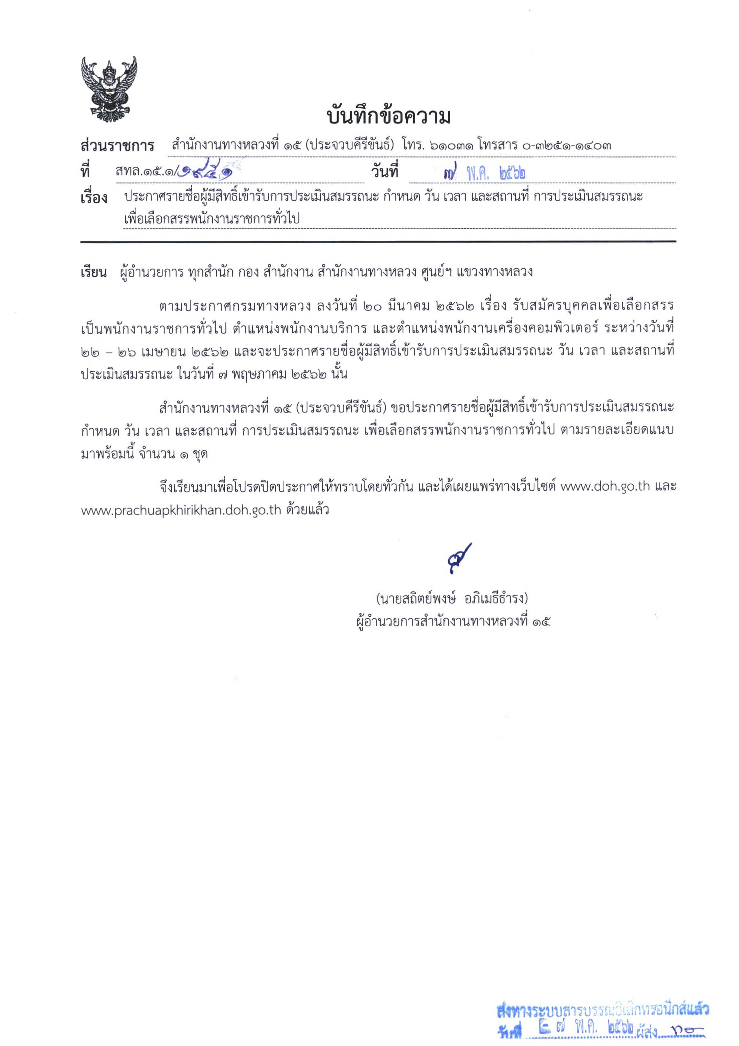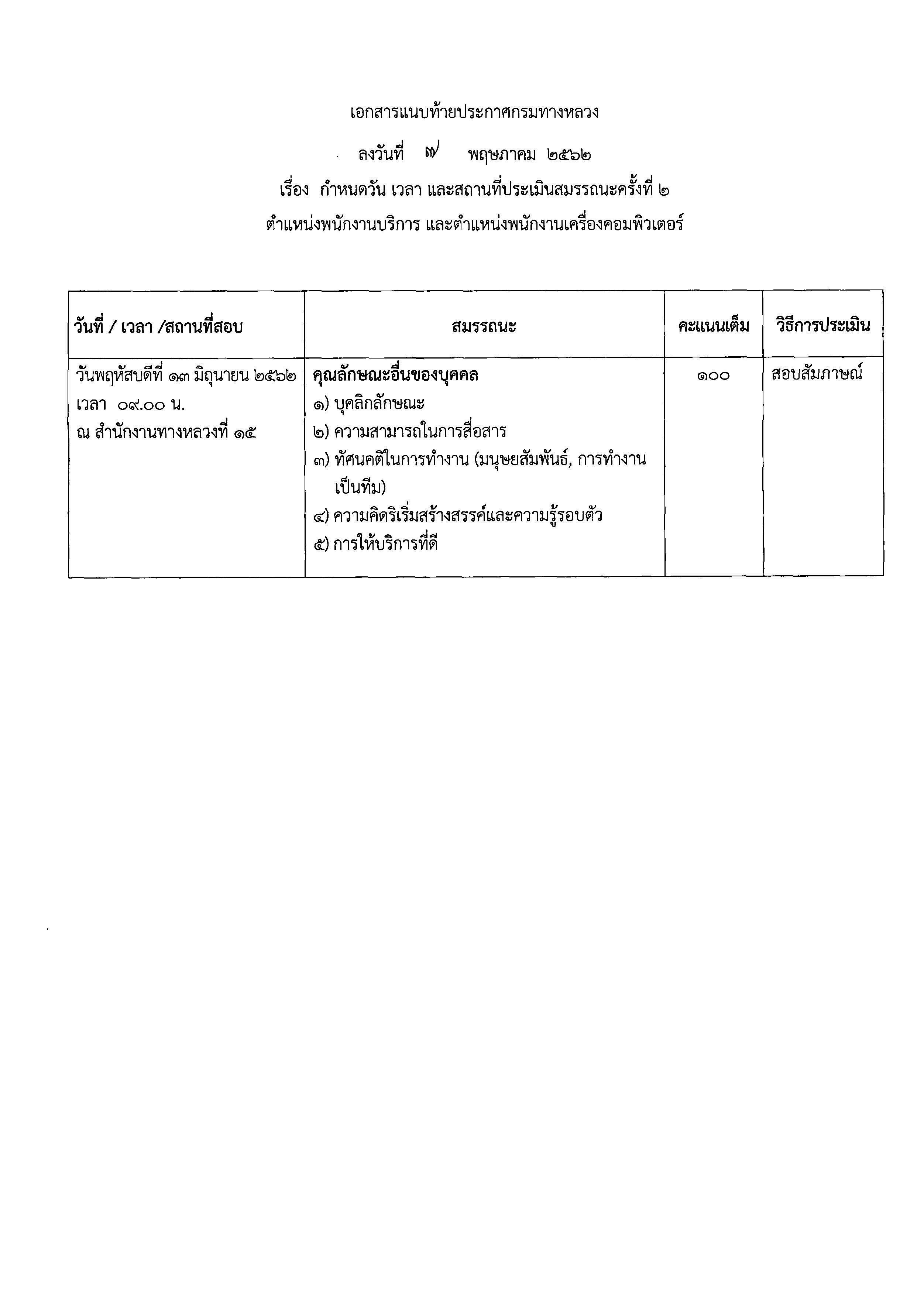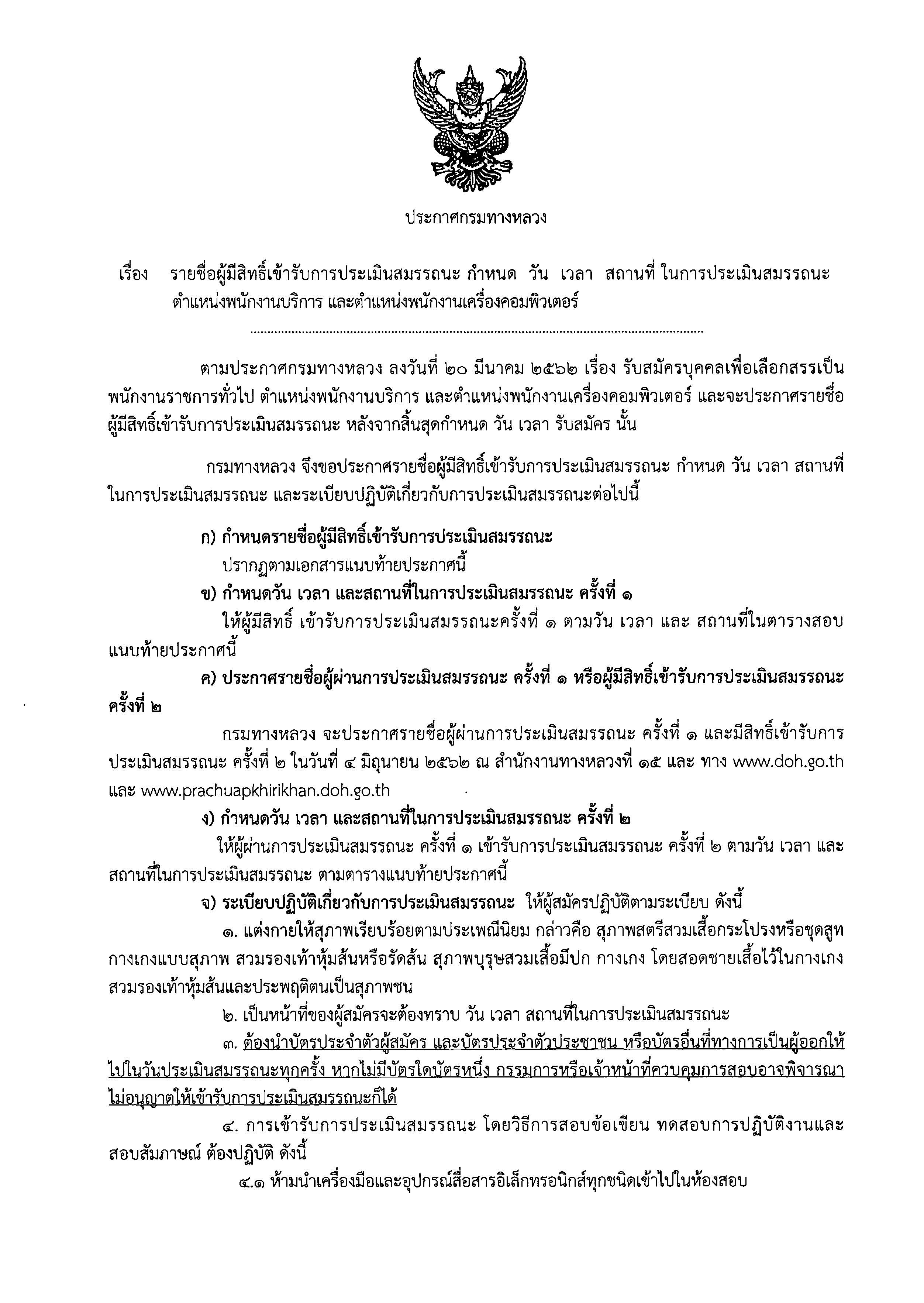 สำนักงานทางหลวงที่ ๑๕ (ประจวบคีรีขันธ์) ขอประกาศรายชื่อผู้มีสิทธิ์เข้ารับการประเมินสมรรถนะ กำหนด วัน เวลา และสถานที่ การประเมินสมรรถนะ เพื่อเลือกสรรพนักงานราชการทั่วไป ตำแหน่งพนักงานบริการ และตำแหน่งพนักงานเครื่องคอมพิวเตอร์