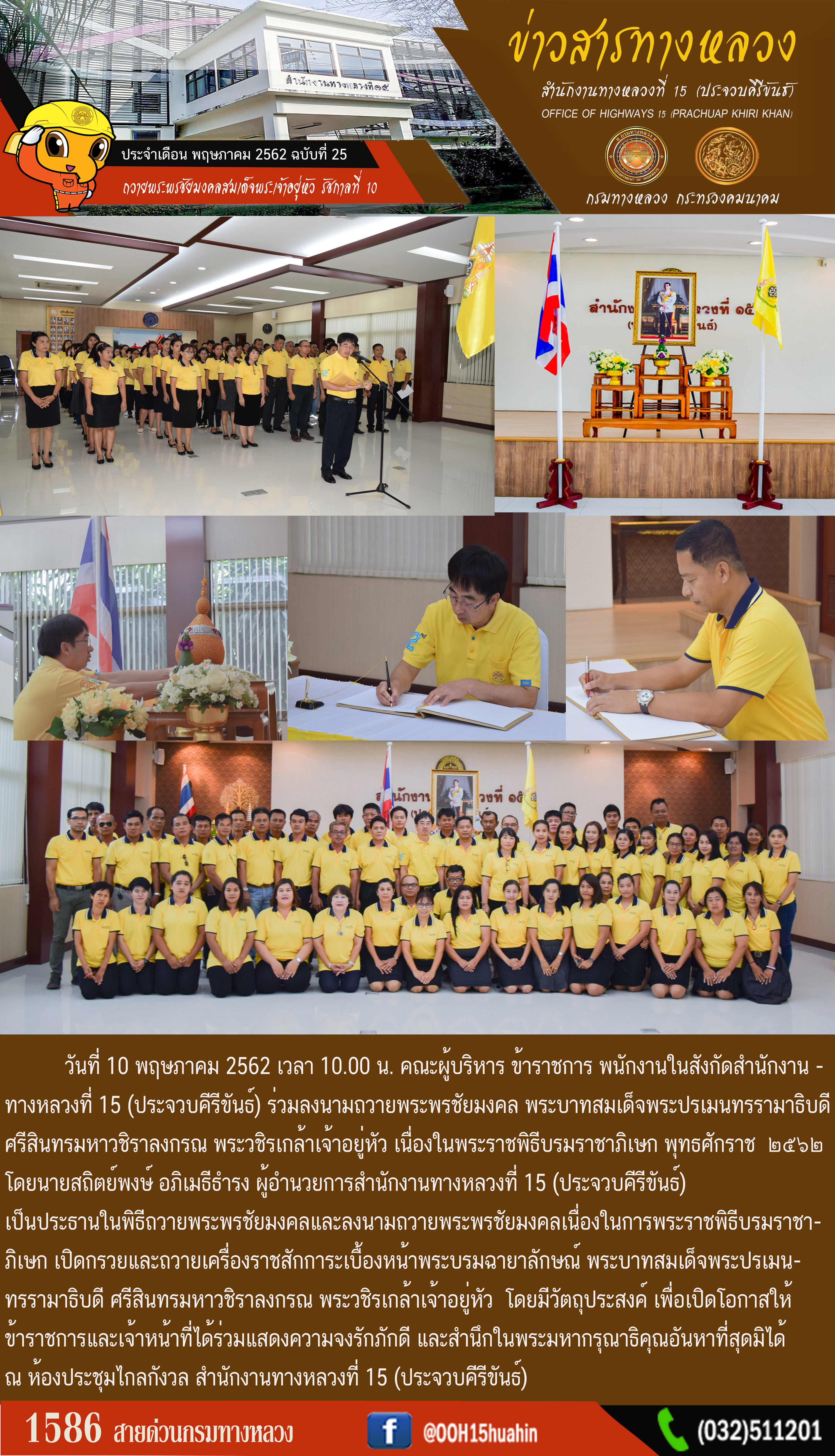 วันที่ 10 พฤษภาคม 2562 เวลา 10.00 น. คณะผู้บริหาร ข้าราชการ พนักงานในสังกัดสำนักงานทางหลวงที่ 15 (ประจวบคีรีขันธ์) ร่วมลงนามถวายพระพรชัยมงคล พระบาทสมเด็จพระปรเมนทรรามาธิบดี ศรีสินทรมหาวชิราลงกรณ พระวชิรเกล้าเจ้าอยู่หัว เนื่องในพระราชพิธีบรมราชาภิเษก พุทธศักราช ๒๕๖๒ โดยนายสถิตย์พงษ์ อภิเมธีธำรง ผู้อำนวยการสำนักงานทางหลวงที่ 15 (ประจวบคีรีขันธ์) เป็นประธานในพิธีถวายพระพรชัยมงคลและลงนามถวายพระพรชัยมงคลเนื่องในการพระราชพิธีบรมราชาภิเษก เปิดกรวยและถวายเครื่องราชสักการะเบื้องหน้าพระบรมฉายาลักษณ์ พระบาทสมเด็จพระปรเมนทรรามาธิบดี ศรีสินทรมหาวชิราลงกรณ พระวชิรเกล้าเจ้าอยู่หัว โดยมีวัตถุประสงค์ เพื่อเปิดโอกาสให้ข้าราชการและเจ้าหน้าที่ได้ร่วมแสดงความจงรักภักดี และสำนึกในพระมหากรุณาธิคุณอันหาที่สุดมิได้ ณ ห้องประชุมไกลกังวล สำนักงานทางหลวงที่ 15 (ประจวบคีรีขันธ์)
